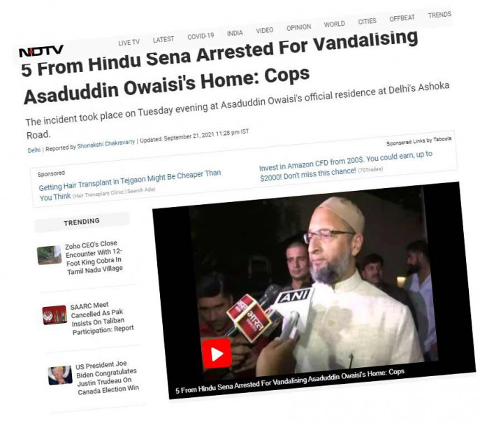ভারতের সাংসদ আসাদউদ্দিন ওয়াইসির বাড়িতে হামলা, পাঁচ হিন্দুসেনা আটক