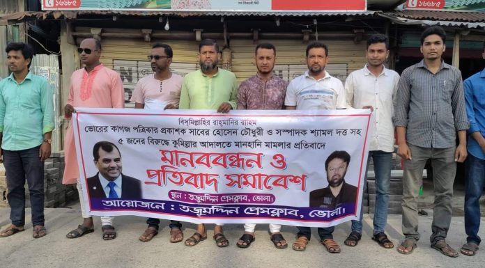 ভোরের কাগজের প্রকাশক ও সম্পাদকের বিরুদ্ধে মামলার প্রতিবাদে তজুমদ্দিন প্রেসক্লাবের মানববন্ধন