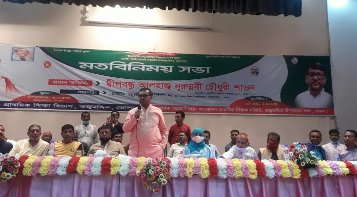 ভোলার তজুমদ্দিনে করোনাকালীন সময়ে প্রাথমিক শিক্ষার গুনগত মান উন্নয়নে ম্যানেজিং কমিটির সভাপতি ও প্রাথমিক বিদ্যালয়ের শিক্ষক বৃন্দের সাথে মতবিনিময় সভা অনুষ্ঠিত হয়। শনিবার বিকাল ৪ ঘটিকায় তজুমদ্দিন প্রাথমিক শিক্ষা বিভাগের আয়োজনে উপজেলা পরিষদ হলরুমে মতবিনিময় সভায় প্রধান অতিথির বক্তব্য রাখেন ভোলা-৩ আসনের সংসদ সদস্য নুরুন্নবী চৌধুরী শাওন।