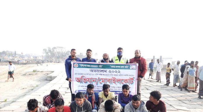 সেলিম রেজা,তজুমদ্দিন প্রতিনিধি,ভোলা নিউজ২৪ডটকম।। ভোলার তজুমদ্দিনের মেঘনায় নিষিদ্ধ সময়ে মাছ শিকার করায় ১২ জেলেকে আটক করে ভ্রাম্যমান আদালতের মাধ্যমে ৪০ হাজার টাকা জরিমানা আদায় করা হয়েছে। মেঘনার বিভিন্ন পয়েন্টে অভিযান চালিয়ে জাল, মাছ ও দুটি নৌকাসহ তাদের আটক করা হয়।