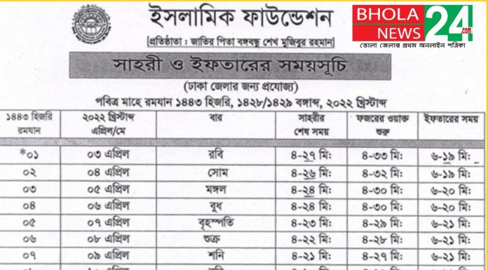 সময়সূচি অনুযায়ী, ৩ এপ্রিল প্রথম রমজানে ঢাকায় সেহরির শেষ সময় ভোররাত ৪টা ২৭ মিনিট ও ইফতারির সময় ৬টা ১৯ মিনিট।