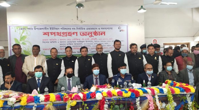 স্টাফ রির্পোটার,ভোলা নিউজ২৪ডটকম।। পঞ্চম ধাপে অনুষ্ঠিত ইউপি নির্বাচনে ভোলা সদর উপজেলার ইউনিয়ন পরিষদের (ইউপি) নব-নির্বাচিত চেয়ারম্যান ও ইউপি সদস্যদের শপথ গ্রহন অনুষ্ঠিত হয়েছে।