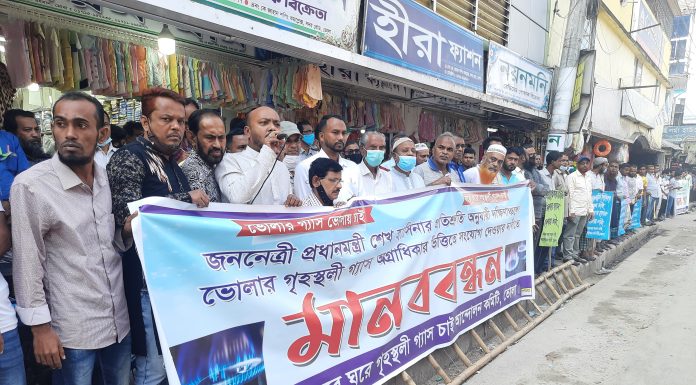 ভোলা নিউজ ২৪ ডটকম ।। ভোলার গ্যাস ভোলায় চাই, ঘরে ঘরে গৃহস্থলির কাজে গ্যাস চাই এই স্লোগানকে সামনে রেখে গ্যাস সংযোগের দাবিতে মানববন্ধন অনুষ্ঠিত হয়েছে।