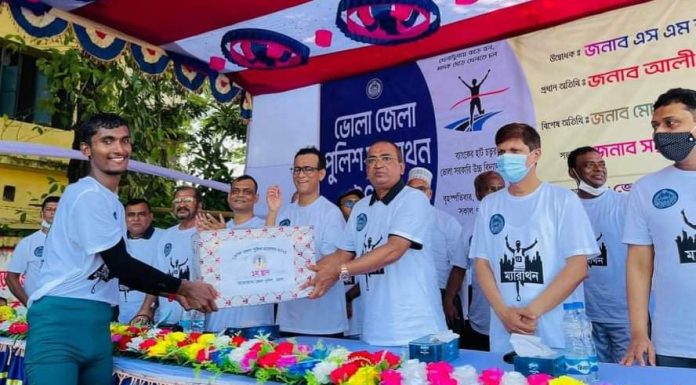 মাদকের বিরুদ্ধে জনসচেতনতা বৃদ্ধির লক্ষ্যে ভোলা জেলা পুলিশের ম্যারাথন প্রতিযোগিত অনুষ্ঠিত হয়েছে। আজ বৃহস্পতিবার ( ১৪ অক্টোবর) সকালে জেলা পুলিশের আয়োজনে মিনি ম্যারাথন প্রযোগিতার আয়োজন করা হয়।