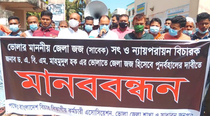 ভোলা নিউজ ২৪ ডটকম :: ভোলার বিদায়ী জেলা ও দায়রা জজ ডাঃ এ বি এম মাহামুদুল হক এর বদলির আদেশ বাতিল ও তাকে পূর্নবহালের দাবিতে ভোলায় মানববন্ধন অনুষ্ঠিত হয়েছে। কর্মকর্তা, কর্মচারীসহ সাধারন মানুষ এই মানববন্ধনে অংশ গ্রহন করে।