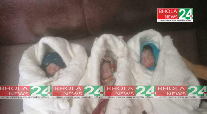 ভোলায় নরমাল ডেলিভারির মাধ্যমে ৫ মিনিটের ব্যবধানে তিনটি পুত্র সন্তান প্রসব করেছেন জান্নাত বেগম (২০) নামে এক গৃহবধূ। তিনি ভোলার বোরহানউদ্দিন উপজেলার মনিরাম এলাকার নূর মাহমুদের স্ত্রী।