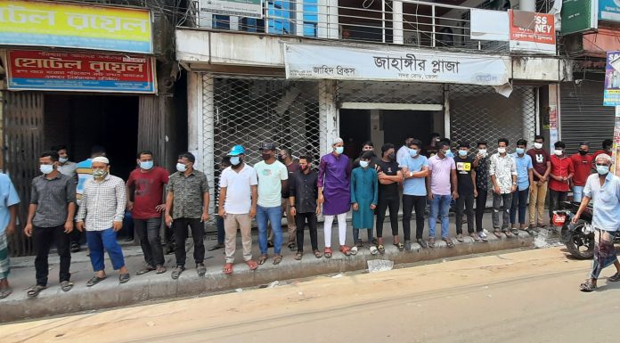 বিভিন্ন মার্কেটের ব্যবসায়ী ও কর্মচারীরা মানববন্ধন কর্মসূচী পালন করেন। মঙ্গলবার (২০ এপ্রিল) দুপুরে জাহাঙ্গির প্লাজা,তালুকদার ভবন,রানী প্লাজা,জিয়া সুপার মার্কেট এর শতাধিক ব্যবসায়ীরা এই কর্মসুচী পালন করেন।