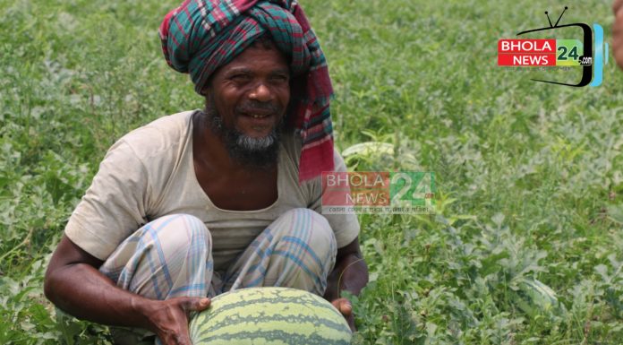 ভোলা নিউজ২৪ডটকম।। ভোলায় তরমুজের ভালো ফলন ও দাম ভালো পাওয়ায় বেজায় খুশি তরমুজ চাষিরা। চরে চরে এখন চলছে তরমুজ বেচা কেনার ধুম। বেপররিরা মাঠ থেকেই তরমুজ কিনে নিয়ে যাচ্ছে। ভোলার তরমুজ চলে যাচ্ছে বরিশাল -ঢাকা সহ দেশের বিভিন্ন প্রান্তে।