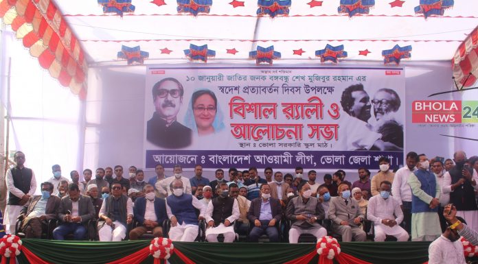রাকিব উদ্দিন অমি,ভোলা প্রতিনিধি।।জাতির জনক বঙ্গবন্ধু শেখ মুজিবুর রহমানের ৪৯তম স্বদেশ প্রত্যাবর্তন দিবস ভোলায় যথাযোগ্য মর্যাদার মধ্যে দিয়ে পালিত হয়েছে। এ উপলক্ষে রবিবার(১০জানুয়ারি) সকালে ১২টায় ভোলা সরকারি স্কুল মাঠে ভোলা জেলা আওয়ামী লীগের আয়োজনে এক আলোচনা সভা ও র্যালী অনুষ্ঠিত হয়।