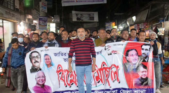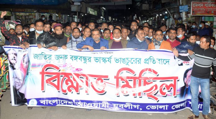 শনিবার (৫ ডিসেম্বর) সন্ধ্যায় ভোলা জেলা যুবলীগের নেতৃত্বে ভোলা পৌর সভার সামনে থেকে বিক্ষোভ মিছিল টি বের হয়। পরে ভোলা শহরে প্রধান প্রধান সড়ক প্রদক্ষিন করেন। বিক্ষোভ মিছিলটি নেতৃত্ব দেন ভোলা পৌর সভার মেয়র ও যুবলীগের সভাপতি মনিরুজ্জামান মনির।