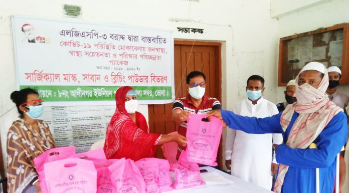 ভোলার আলীনগর ইউনিয়নে কোভিট-১৯ পরিস্থিত মোকাবেলায় জনসাস্থ্য,স্বাস্থ্য সচেতনতা ও পরিস্কার পরিচ্ছন্নতা প্যাকেজ এর অংশ হিসাবে ইউনিয়নের ১৫০ হত দরিদ্র পরিবারের মধ্যে সার্জিক্যাল মাস্ক-সাবান ও ব্লিচিং পাউডার বিতরন করা হয়। এলজিএসপি-৩ বরাদ্ধ দ্বারা বাস্তবায়িত বৃহস্পতিবার(১৬ জুলাই)দুপুরে আলী নগর ইউনিয়ন পরিষদে এলজিএসপি প্রকল্পের ডিএফও সানজিদা খানম মুন্নি প্রধান অতিহি হিসাবে উপস্থিত থেকে হত দরিদ্র পরিবারের মাঝে এই সামগ্রী বিতরন করেন।...