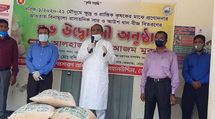 আদিল হোসেন তপু: ভোলার বোরহানউদ্দিনে সামাজিক দূরত্ব বজায় রেখে খরিফ/১,২০২০-২০২১ মৌসুমে ক্ষুদ্র ও প্রান্তিক কৃষকদের মাঝে প্রণোদনার আওতায় বিনামূল্যে রাসায়নিক সার ও আউশ ধানের বীজ বিতরণ করা হয়।