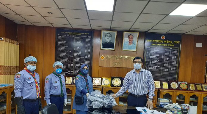 জেলা প্রশাসকের কক্ষে এ সুরক্ষা সামগ্রী হস্তান্তর করেন ভোলা জেলা রোভার।