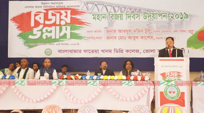 আদিল হোসেন তপু,ভোলা নিউজ২৪ডটনেট।। ভোলায় মহান বিজয় দিবসে বিজয় উল্লাস উৎসব শুরু হয়েছে। আজ রোববার বর্ণাঢ্য র্যালির মধ্য দিয়ে উৎসবের উদ্বোধন করেন জেলা পরিষদ চেয়ারম্যান ও জেলা আওয়ামী লীগের সাধারন সম্পাদক আবদুল মমিন টুলু।