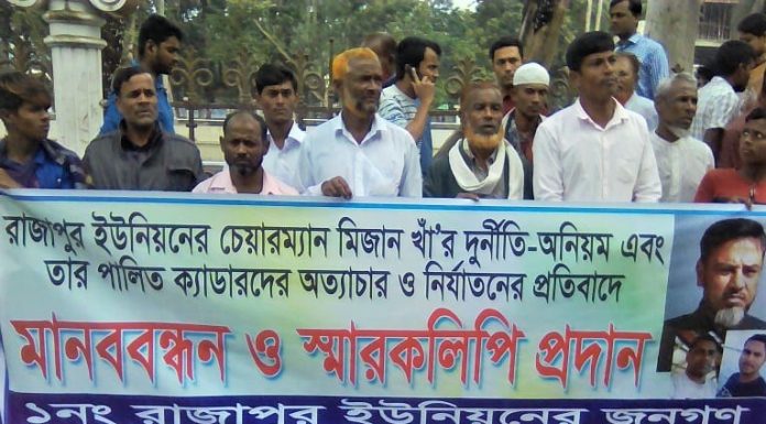 মোঃ আফজাল হোসেন ॥ ভোলায় ইউনিয়ন পরিষদের চেয়ারম্যানের অনিয়ম-দূর্নীতি ও অত্যাচারের প্রতিবাদে মানববন্ধন কর্মসূচি পালন করেছে এলাকাবাসী। এসময় চেয়ারম্যন গ্রুপের লোকজন এসে মানববন্ধকারীদের নাজেহাল করে। একই সাথে জিবননাশের হুমকি দেয়ার অভিযোগ উঠেছে চেয়ারম্যান ও তার ক্যাডারদের বিরুদ্ধে।