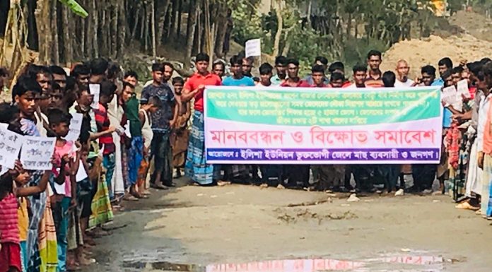 ভোলা নিউজ২৪ডটনেট।। ভোলা সদরের ইলিশা ইউনিয়নের জংশন বাজারের সোনাডগী এলাকায় বেড়ী বাঁধ নির্মাণ করার খাল বন্ধ হওয়ার কারণে ঝড় জলোচ্ছ্বাসের সময় জেলেদের নৌকা ও ট্রলার খালে নিরাপাদ আশ্রয়ে রাখতে পারছেন না। এতে ভোগান্তিতে পরেছে প্রায় ১০ হাজার জেলে। তাই জেলেদের সম্পদ ও জীবন রক্ষার ২ টি শাখা খালের দাবীতে বিক্ষোভ সমাবেশ ও মানববন্ধন অনুষ্ঠিত হয়েছে।
