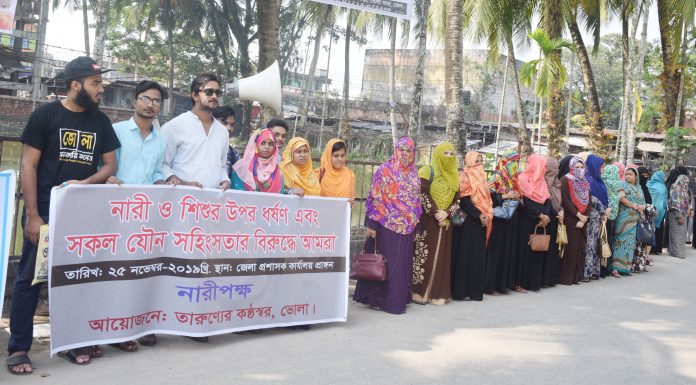 স্টাফ রিপোর্টার,ভোলা নিউজ২৪ডটনেট॥‘নারী-পুরুষ সমতা রুখতে পারে সহিংসতা’ এই প্রতিপাদ্য বিষয়কে সামনে রেখে ভোলায় ভোলায় আন্তজার্তিক নারী নির্যাতন প্রতিরোধ দিবস পালিত হয়। দিবসটি উপলক্ষ্যে সোমবার(২৫ নভেম্বর) সকালে জেলা প্রশাসক কার্যলয়ের সামনে জেলা প্রশাসন ও মহিলা বিষয়ক অধিদপ্তর,তারুন্যের কন্ঠস্বর প্লাটফর্ম এর আয়োজনে ঘন্টাব্যাপী এক মানববন্ধন কর্মসূচী পালন করা হয়।এসময় বক্তব্য রাখেন- মহিলা বিষয়ক অধিদপ্তর উপ-পরিচালক মো: ইকবাল হোসেন,আবৃত্তি শিল্পি মসিউর রহমান...