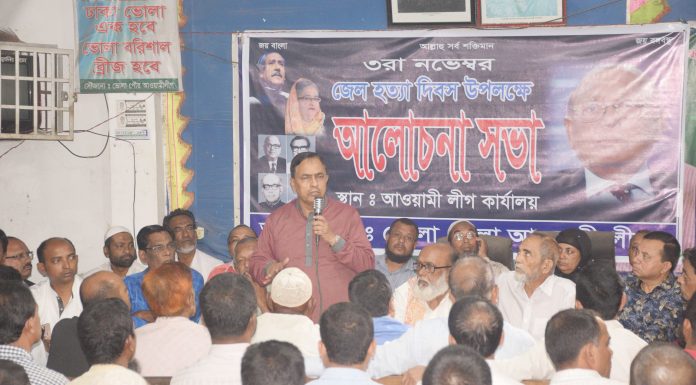 আদিল হোসেন তপু : ভোলায় জেল হত্যা দিবস উপলক্ষ্যে ভোলা জেলা আওয়ামী লীগের উদ্যোগে এক আলোচনা সভা অনুষ্ঠিত হয়। রবিবার (৩ নভেম্বর) সন্ধ্যায় ভোলা জেলা আওয়ামীলীগ কার্যলয়ে এই আলোচনা সভা অনুষ্ঠিত হয়। এতে জেলা আওয়ামীলীগের সাধারন সম্পাদক ও জেলা পরিষদ চেয়ারম্যান আব্দুল মমিন টুলু প্রধান বক্তা হিসাবে বক্তব্য রাখেন।আলোচনা সভায় জেলা আওয়ামীলীগের সহ-সভাপতি মো: গোলাম মোস্তফা মিয়ার সভাপত্বিতে আলোচনা...
