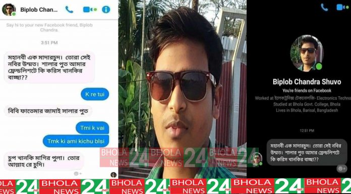 শুক্রবার বিকেলে তার biplob chandra shuvo নামের ফেসবুক আইডি থেকে তার ফ্রেন্ড লিস্টের বেশ কয়েক জনের কাছে আল্লাহ এবং রাসুল (সঃ) কে নিয়ে কুরুচিপূর্ণ ভাষায় গালাগালের ম্যাসেজ আসে। বিপ্লব চন্দ্র শুভ বোরহানউদ্দিন উপজেলার কাচিয়া ইউনিয়নের ২নং ওয়ার্ডের...