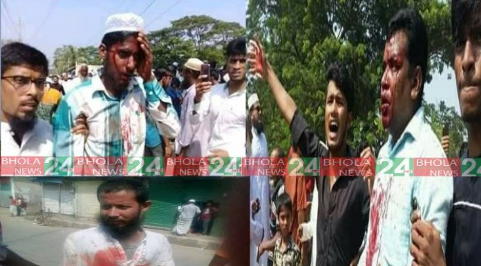 স্টাফ রিপোর্টার,ভোলা নিউজ২৪ডটনেট॥ ফেসবুকে মহা নবী (সঃ)কে কটুক্তি করা নিয়ে ভোলায় সাধারণ তৌহীদি জনতার বিক্ষোভ সমাবেশকে কেন্দ্র করে পুলিশের সাথে মুসল্লীদের সংঘর্ষে চার জন নিহত ও ১০ পুলিশসহ প্রায় দের শতাধিক আহত হয়েছে।