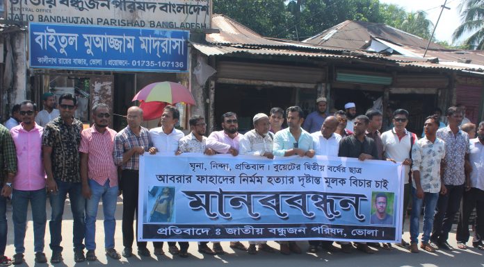 বাংলাদেশ প্রকৌশল বিশ^বিদ্যালয় (বুয়েট) দ্বিতীয় বর্ষের শিক্ষার্থী আবরার ফাহাদকে নির্মম ভাবে হত্যার প্রতিবাদে ও দোষীদের দৃষ্টান্তমূলক শাস্তির দাবিতে মানববন্ধন করেছে জাতীয় বন্ধুজন পরিষদ ভোলা । মঙ্গলবার ৮ (অক্টোবর) দুপুর ১২টার দিকে ভোলা কালীনাথ রায়ের বাজার বন্ধুজন পরিষদ কার্যালয়ের সামনে বন্ধুজন পরিষদের প্রধান সমন্বয়কারী আসিফ আলতাফের নেতৃত্বে এই মানব বন্ধন অনুষ্ঠিত হয় ।