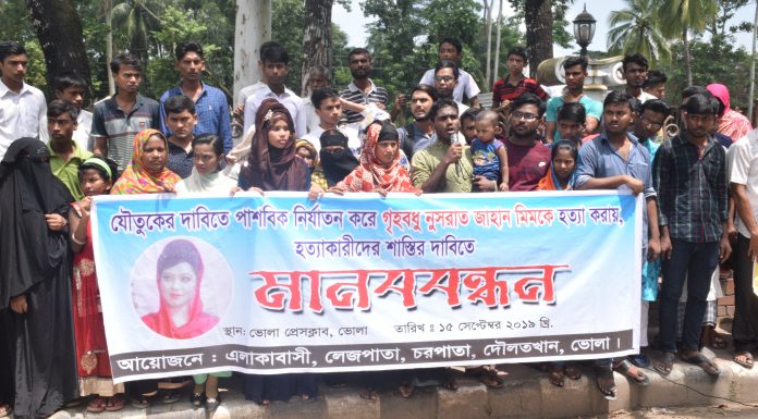 আদিল হোসেন তপু ॥ ভোলায় দৌলতখানে যৌতুকের জন্য গৃহবধূ নুসরাত জাহান মিম হত্যার বিচারের দাবিতে মানববন্ধন করেছে এলাকাবাসী। রবিবার(১৫ সেপ্টেম্বর) দুপুরে ভোলা প্রেস কাবের সামনে ঘন্টাব্যাপী এ মানববন্ধন কর্মসূচি পালন করা হয়। এতে অংশগ্রহণকারীরা মিম এর হত্যাকারীদের দৃষ্টান্তমূলক শাস্তির দাবি জানান। এ সময় স্বজনরা অভিযোগ করেন, হত্যাকান্ডকে ভিন্ন খাতে প্রভাবিত করতে আসামিপরে লোকজন চক্রান্ত করছেন। ঘটনার পর থেকে অভিযুক্ত...