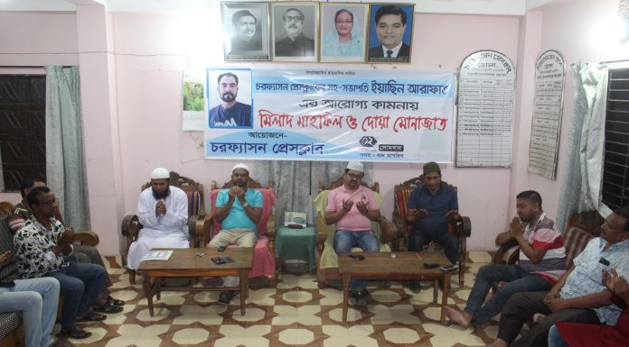 চরফ্যাশন প্রতিনিধি,ভোলা নিউজ২৪ডটনেট॥ চরফ্যাশন প্রেসক্লাব সহ-সভাপতি মো.ইয়াছিন আরাফাতের আরোগ্য কামনায় মিলাদ ও দোয়া মোনাজাত অনুষ্ঠিত হয়েছে। গতকাল সোমবার সন্ধ্যা প্রেসক্লাব হলরুমে এই দোয়া মোনাজাত অনুষ্ঠিত হয়। প্রেসক্লাব সভাপতি আলহাজ¦ মো.আবুল হাসেম মহাজন এর সভাপতিত্বে দোয়া মোনাজাতে অংশ গ্রহণ করেন প্রেসক্লাব সাধারন সম্পাদক প্রভাষক মনির আহমেদ শুভ্রসহ জাতীয় আঞ্চলিক পত্রিকার সংবাদ কর্মীরা। রাজধানীর ঢাকা আনোয়ার খান মর্ডান হাসপাতালে চিকিৎসাধীন ইয়াছিন...