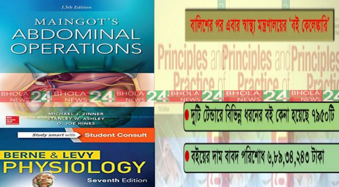 ভোলা নিউজ২৪ডটনেট।। সার্জারির ছাত্র ও শিক্ষানবিশদের টেক্সট বই ‘প্রিন্সিপাল অ্যান্ড প্র্যাকটিস অব সার্জারি’। গোপালগঞ্জের শেখ সায়েরা খাতুন মেডিক্যাল কলেজের জন্য এই বইয়ের ১০টি কপি কিনেছে স্বাস্থ্য অধিদফতর। বইটির বাজারমূল্য সাড়ে পাঁচ হাজার টাকা হলেও স্বাস্থ্য অধিদফতর প্রতিটি বই কিনেছে ৮৫ হাজার ৫০০ টাকা করে। সেই হিসাবে ১০ কপি বইয়ের মোট দাম পরেশোধ করা হয়েছে ৮ লাখ ৫৫ হাজার টাকা।...