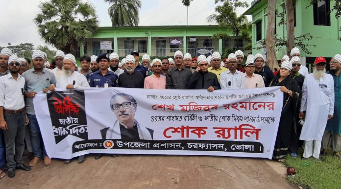সোহেব চৌধুরী চরফ্যাশন প্রতিনিধি।। ভোলার চরফ্যাশনে নানা কর্মসূচির মধ্য দিয়ে জাতির জনক বঙ্গবন্ধু শেখ মুজিবর রহমানে ৪৪তম শাহাদাৎ বাষির্কী ও জাতীয় শোক দিবস পালন করা হয়েছে। দিবসটি উপলক্ষে আজ সকালে উপজেলা আওয়ামী লীগ র্যালী ও আলোচনা সভার আয়োজন করে। এছাড়া বিভিন্ন সংগঠনের উদ্দ্যোগে সাংস্কৃতিক অনুষ্ঠানসহ নানা কর্মসূচীর আয়োজন করা হয়েছে।