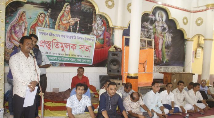স্টাফ রিপোর্টার ।। ভোলায় ভগবান শ্রী কৃষ্ণের জন্মাষ্টমী উদযাপনে ব্যাপক প্রস্তুতি নিয়েছে জেলা পূজা উদযাপন পরিষদ। এ নিয়ে শুক্রবার কেন্দ্রীয় মদন মোহন মন্দিরে হিন্দু ধর্মালম্বীদের এক সমাবেশ অনুষ্ঠিত হয়। সমাবেশে জেলার ৭ উপজেলার পূজা উদযাপন পরিষদের নেতৃবৃন্দসহ বিভিন্ন মন্দির কমিটির নেতারা অংশ নেন। এ সময় জেলা পূজা উদযাপন পরিষদের সভাপতি সাবেক অধ্যক্ষ প্রফেসর দুলাল চন্দ্র ঘোষের সভাপতিত্বে বক্তব্য রাখেন...