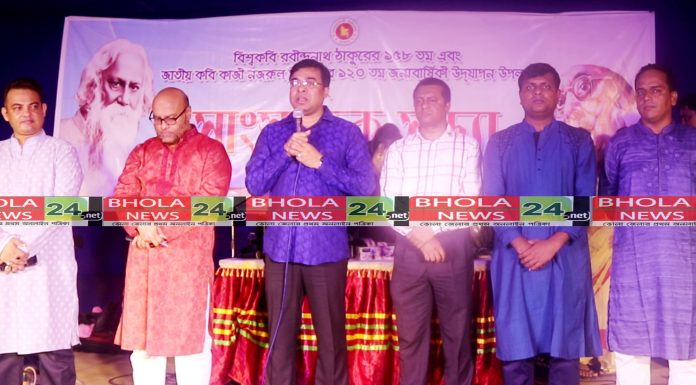 আদিল হোসেন তপু,ভোলা নিউজ২৪ডটনেট।।ভোলায় বিশ্বকবি রবীন্দ্রনাথ ঠাকুরের ১৫৮তম এবং জাতীয় কবি কাজী নজরুল ইসলামের ১২০তম জন্মবার্ষিকী উদযাপন উপলক্ষে সংস্কৃতিক অনুষ্ঠান, সম্মাননা প্রদান, আলোচনা সভা অনুষ্ঠিত হয়। সোমবার (২৪) জুন সন্ধ্যায় জেলা প্রশাসনের আয়োজনে জেলা প্রশাসক চত্বরে আয়োজিত অনুষ্ঠানে প্রধান অতিথি হিসাবে উপস্থিত ছিলেন, জেলা প্রশাসক মো: মাসুদ আলম ছিদ্দিক।