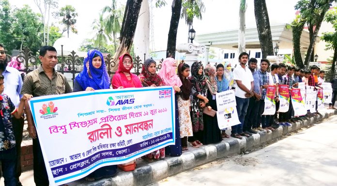 আদিল হোসেন তপু।। ‘শিশু শ্রম নয়, শিশুর জীবন হোক স্বপ্নময়’ এই স্লোগানকে সামনে রেখে ভোলায় বিশ্ব শিশু শ্রম প্রতিরোধ দিবসে মানববন্ধন ও র্যালি অনুষ্ঠিত হয়।