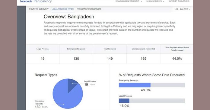 ২০১৮ সালে জুলাই থেকে ডিসেম্বর মাস পর্যন্ত ফেসবুকের কাছে ১৪৯টি অনুরোধে এ তথ্য চাওয়া হয়।