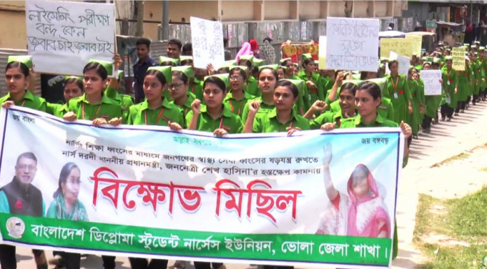স্টাফ রিপোর্টার,ভোলা নিউজ২৪ডটনেট।।ভোলায় তিন দফা দাবিতে প্রধানমন্ত্রী শেখ হাসিনার হস্তক্ষেপ কামনা করে মানববন্ধন ও বিক্ষোভ মিছিল করেছেন ভোলা নার্সিং ইন্সটিটিউটের কয়েকশ’ শিক্ষার্থী।