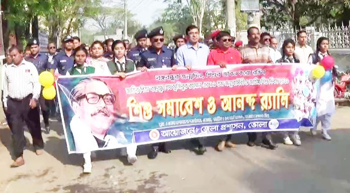 বঙ্গবন্ধুর জন্মদিন, শিশুর জীবন করো রঙিন’’ এ শ্লো-গানের ভোলায় নানা আয়োজনে স্বাধীনতার মহান স্থপতি জাতির পিতা বঙ্গবন্ধু শেখ মুজিবুর রহমানের ৯৯ তম জন্মবার্ষিকী এবং জাতীয় শিশু দিবস পালিত হয়েছে।