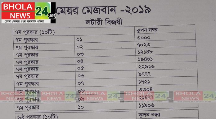 গত কাল অনুষ্ঠিত হয় মেয়র মেজবান অনুষ্ঠান।এই অনুষ্ঠান শেষে লটারির ড্র ঘোষনা কারা হয় ।বিজয়ি হয়েছেন যারা তারা ৭ দিনের মধ্যে তাদের কুপন নাম্বার দিয়ে ভোলা পৌর সভা থেকে পুরুষ্কার নিতে পারবেন।