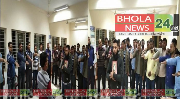 অমি আহমেদ,ভোলা নিউজ২৪ডটনেট ।। ভোলার লালমোহন ও বোরহান উদ্দিন থানাকে নিয়ে মাদকের বিরুদ্ধে শপথ গ্রহন করেন অতিরিক্ত পুলিশ সুপার লালমোহন সার্কেল। আর সেই শপথ গ্রহণের ছবি ফেসবুকে ছরিয়ে পরে দ্রুত। পুলিশের এই কাজ কে সবাই সাধুবাদ জানান। ফেসবুুুক স্ট্যাটাসে এই ঘটনাতে পুলিশের উপরে সবার আস্থা ফিরেে আসবে বলে বিভিন্ন মানুুষ কমেণ্ট করেন।
