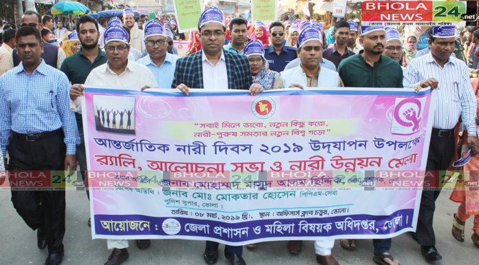 অমি আহমেদ,ইমতিয়াজুর রহমান,ভোলা নিউজ২৪ডটনেট ॥“ সবাই মিলে ভাবো,নতুন কিছু করো,নারী-পুরুষ সমতার নতুন বিশ্ব গড়ো” স্লোগানকে সামনে রেখে ভোলায় বর্নাঢ্য আয়োজনের মধ্য দিয়ে পালিত হয়েছে আন্তর্জাতিক নারী দিবস।