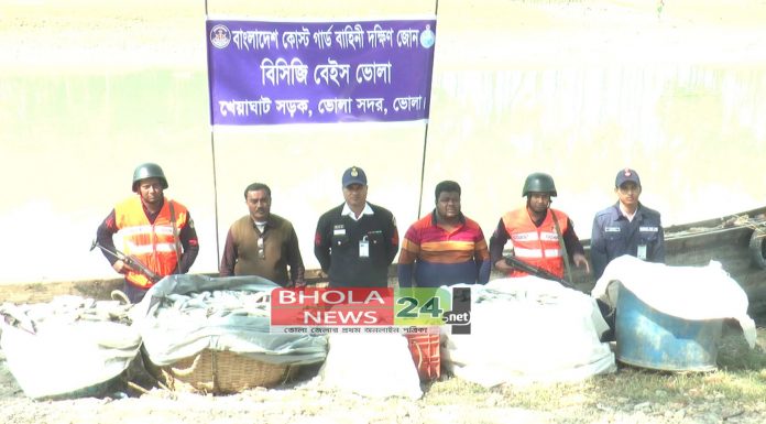 ভোলার মেঘনা- তেতুলিয়া নদীতে কোসট গার্ডের দক্ষিন জোনের যৌথ অভিযানে ১৮ মন ঝাটকা ইলিশ জব্দ করেছে।বুধবার গভীর রাতে কোস্ট গার্ডের এক অভিযানে মেঘন নদীতে কর্নফুলী- ৯ লঞ্চ অভিযান চালিয়ে ৩ মন ও তেতুলিয়া নদীতে ট্রলারে অভিযান চালিয়ে ১৫ মন ঝাটকা ইলিশ জব্দ করে।