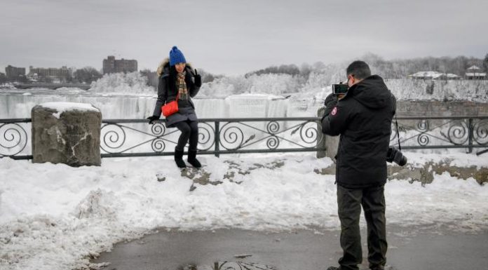 তাপমাত্রা শূন্য ডিগ্রির নিচে নেমে গেছে। এর ফলে নায়াগ্রা জলপ্রপাতের কানাডা অংশের পানি জমে বরফ। পানির বদলে জলপ্রপাত এখন শুভ্র বরফে ঢাকা। সেখানে স্ত্রীর ছবি তুলতে ব্যস্ত এক স্বামী। অন্টারিও, কানাডা, । ছবি: রয়টার্স