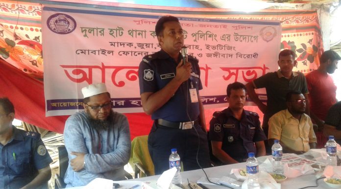 মাইনুদ্দিন হাওলাদার, দুলারহাট ঃ "পুলিশই জনতা-জনতাই পুলিশ" এই স্লোগানকে সামনে রেখে দুলারহাট থানা কমিউনিটি পুলিশিং এর উদ্যোগে দুলার হাট বাজারে শ্রমিকদেরকে নিয়ে মাদক জুয়া,বাল্যবিবাহ ইভটিজিং, মোবাইল ফোনের অপব্যবহার ও জংগীবাদ বিরোধী আলোচনা সভা আয়োজিত হয়। আলোচনা সভায় প্রধান অতিথির বক্তৃতায় দুলারহাট থানার অফিসার ইনচার্জ জনাব মোঃ মিজানুর রহমান পাটওয়ারী বলেন, মাদক,জুয়া, ইভটিজিং,বাল্যবিবাহ এগুলো
