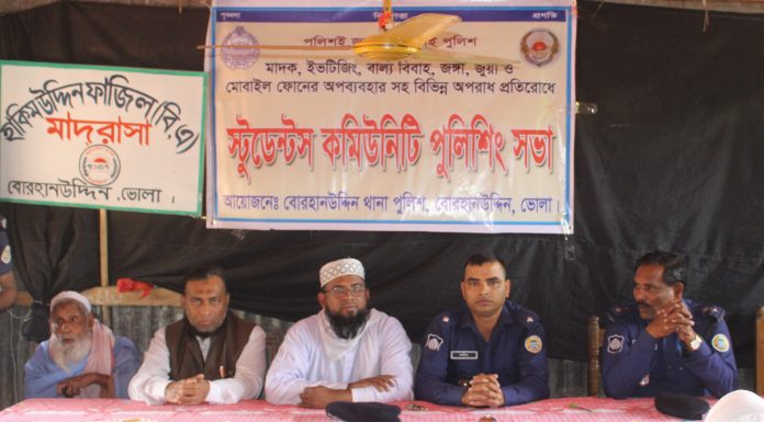 বোরহানউদ্দিন প্রতিনিধি: মাদক, ইভটিজিং, বাল্যবিবাহ, জঙ্গী, জুয়া এবং মোবাইল ফোনের অপব্যবহার রোধে ভোলার বোরহানউদ্দিনের হাকিমউদ্দিন ফাজিল(বি,এ) মাদরাসায় বোরহানউদ্দিন থানা পুলিশের আয়োজনের স্টুডেন্ট কমিউনিটি পুলিশিং অনুষ্ঠিত হয়েছে।